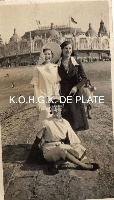 Formaat : 11 x 7 cm. - In de achtergrond het derde kursaal. Op de voorgrond drie modieuze vrouwen op de golfbreker