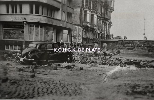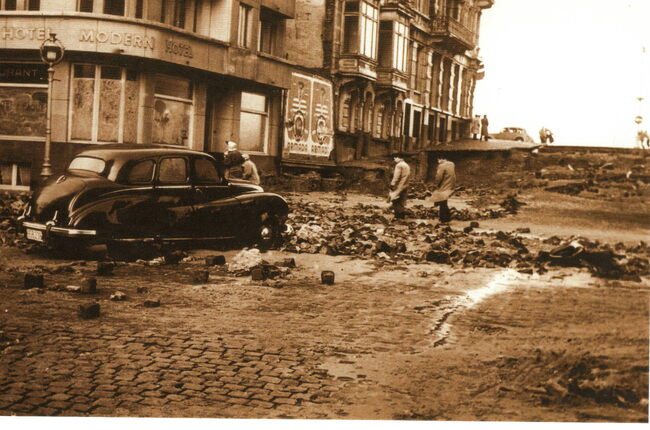 Tropic T 391. - Ostende oender woater 1953. - De hoek van de Kapucijnenstraat en de Van Iseghemlaan. Op de hoek, het "Modern Hotel"