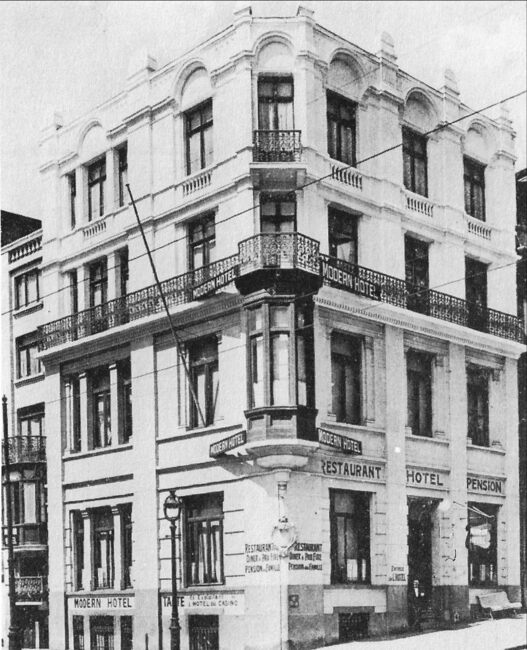 Afdruk. - Formaat : 19 x 29 cm. - Modern Hotel op de hoek van de Kapucijnenstraat en de Van Iseghemlaan. - Uitbaters : C. Derinck en zoon.
