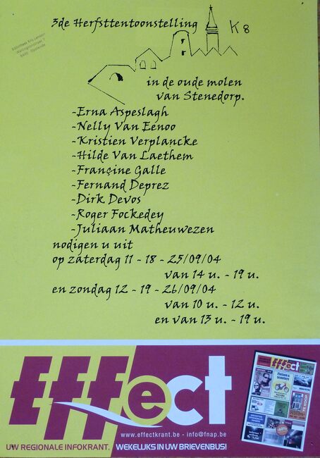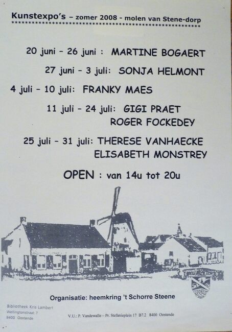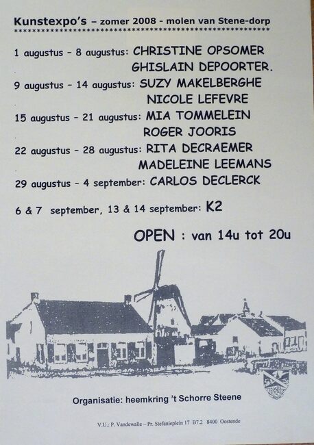 MOLEN VAN STENE ; TENTOONSTELLINGENKUNSTTENTOONSTELLINGENHEEMKRING 'T SCHORRE STEENE ; TENTOONSTELLINGENGORTACK INGRID (KERAMISTE)VAN BEDAF CHRIS (KUNSTSCHILDERES)VISSER SUZANNE (BEELDHOUWSTER)SINNAEVE MIET (KERAMISTE)HELMONT SONIA (KUNSTSCHILDERES)MAES FRANKY (KUNSTSCHILDER)PRAET GIGI (KUNSTSCHILDERES)TANGHE DAMIENNE (BEELDHOUWSTER)ZOETE NICOLE (KUNSTENARES)DEROO CHRISTOPHE (KUNSTSCHILDER)BLONTROCK MARC (FOTOGRAAF BEELDHOUWER)LEFEVRE NICOLE (KUNSTENARES)MAKELBERGE SUZY (KUNSTSCHILDERES)CORDY FREDDY (FOTOGRAAF)LAMBRECHT MARC (FOTOGRAAF)ROSSEEL JEANNINE (BEELDHOUWSTER)MORLION DANNYBALL SUZAN (BEELDHOUWSTER KERAMISTE)DE GROOF EDDY (FOTOGRAAF)LESTAEGHE CHRISTIANE (KUNSTENARES)MOSTREY ELISABETH (KUNSTSCHILDERES)DECLERCQ CARLOS (KUNSTSCHILDER)HANCKE PASCAL (KUNSTSCHILDER)