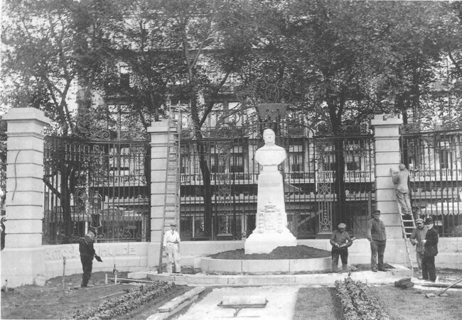Werklieden leggen de laatste hand aan het monument van Auguste Beernaert