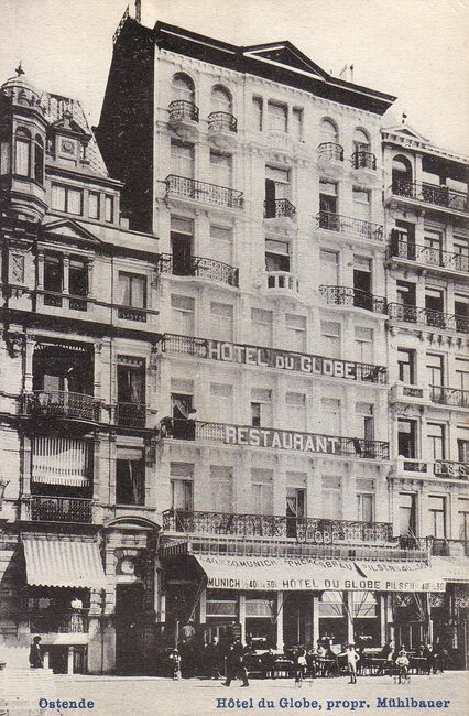Ostende Hôtel du Globe, propr. Mühlbauer. De Zeedijk, tussen de Kursaal-Westhelling en de Berlijnstraat (huidige IJzerstraat). Links detail van Villa Emma-William en rechts detail van Hotel Wellington. In Hôtel du…
