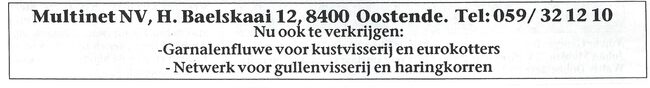 Advertentie : Multinet nv, H. Baelskaai 12, 8400 Oostende, tel 059 / 32 12 10. - Nu ook te verkrijgen : Garnalenfluwe voor kustvisserij en eurokotters. - Netwerk voor gullenvisserij en haringkorren