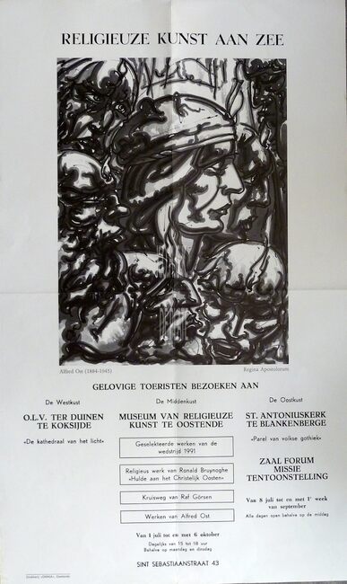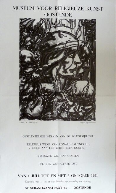 Formaat : 70 x 42 cm. GESELEKTEERDE WERKEN VAN DE WEDSTRIJD 1991. RELIGIEUS WERK VAN RONALD BRUYNOGHE . KRUISWEG VAN RAF GORSEN. WERKEN VAN ALFRED OST. Dagelijks van 15 tot 18 uur. Behalve op maandag en dinsdag.