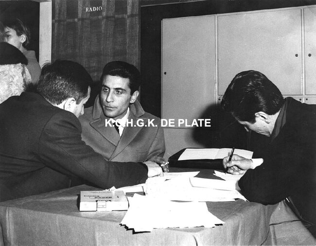 Formaat : 17 x 23 cm. - Charles Aznavour signeert en wordt gefilmd.