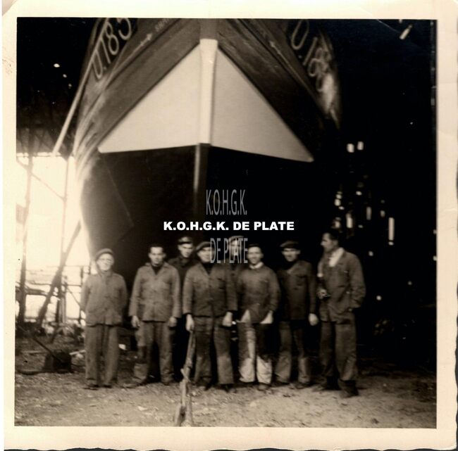 Formaat : 8 x 8 cm. - De O.185 "Schamrock" gebouwd op de werf van August Loy, Nieuwe Werfkaai 3. Van links naar rechts : de scheepstimmerlui Pierre Vandenabeele, Michel Verlinde, René Lauwereins, Charles…