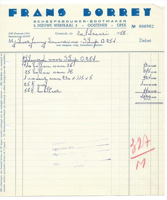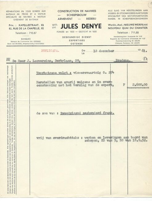 Bureel : Dr Ed. Moreauxlaan 119. - Verklaring dat de O.254 Beatrix - Adriënne in 1931 gebouwd werd op de scheepswerf A. Hillebrant voor rekening van H. Calcoen