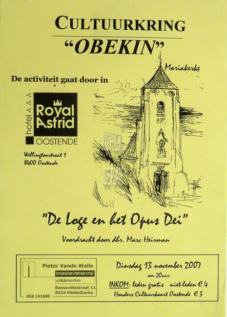 Affiche : Cultuurkring Obekin. De Loge en het Opus Dei. Hotel Royal Astrid. 13/11/2007