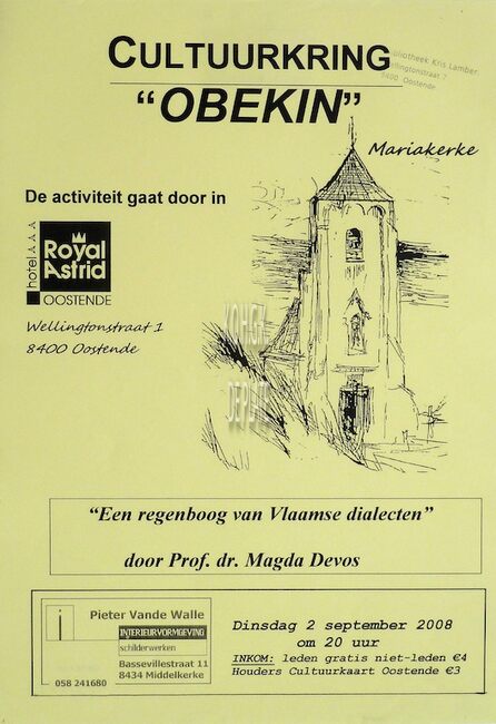 Affiche : Cultuurkring Obekin. Een regenboog van Vlaamse dialecten. Hotel Royal Astrid. 2/09/2008