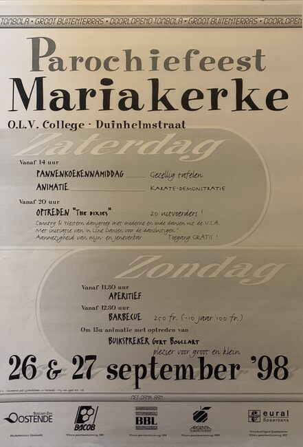 Affiche : Parochiefeest Mariakerke. O.L.V. College Duinhelmstraat. 26-27/09/1998