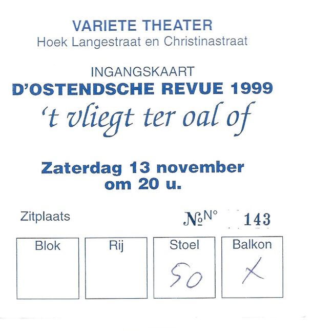 FEYS FREDDY (MUZIKANT)(OOSTENDSE REVUE)LABEEUW RIK (OOSTENDSE REVUE) (TONEELREGISSEUR)DUYCK ROBERT (TJEPPEN KROTTE) (OOSTENDSE REVUE)DUPON PATRICK (KAMIEL PULLE) (OOSTENDSE REVUE) (ACCORDEONIST)BALLETSCHOOL ALANAH WERANGAOOSTENDSE REVUE (NAAM)DE VERKEERDE KEUZE (REVUE)VARIETE THEATER (CHRISTINASTRAAT)PROGRAMMA'S