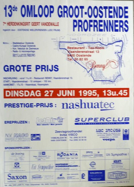 Affiche : Oostendse Wielervrienden Ludo Fryns. 13de Omloop Groot-Oostende profrenners. Dinsdag 27 juni 1995.