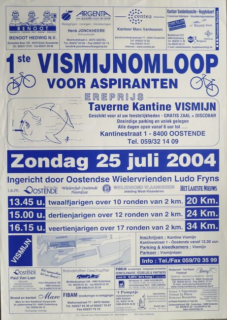 Affiche : OOSTENDSE WIELERVRIENDEN LUDO FRYNS. 1ste VISMIJNOMLOOP VOOR ASPIRANTEN. Vismijn. 25 juli 2004.