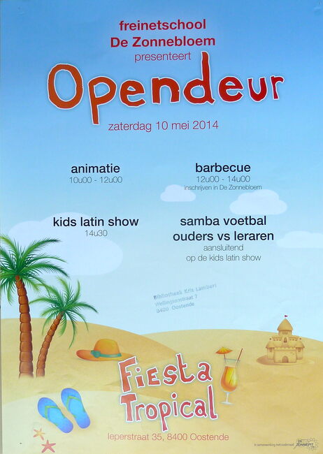 Affiche : Freinetschool De Zonnebloem. Opendeur. Fiesta Tropical. Ieperstraat 35. 10/05/2014