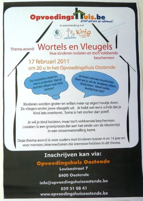 Affiche : Opvoedingshuis Oostende. Thema-avond: Wortels en Vleugels, hoe kinderen loslaten en toch voldoende beschermen. Opvoedingshuis Oostende. 17/02/2011