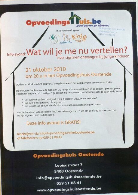 Affiche : Opvoedingshuis Oostende. Info avond : Wat wil je me nu vertellen?, over signalen ontvangen bij jonge kinderen. Opvoedingshuis Oostende. 21/10/2010