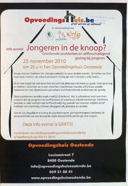Affiche : Opvoedingshuis Oostende. Info avond: Jongeren in de knoop?, Emotionele problemen en zelfbeschadigend gedrag bij jongeren. Opvoedingshuis Oostende. 25/11/2010