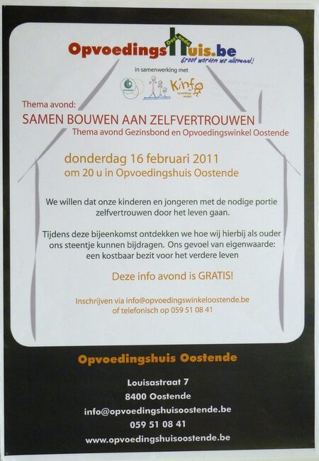 Affiche : Gezinsbond Oostende i.s.m Netwerk Opvoedingsondersteuning Oostende, Opvoedingswinkel Kinfo Oostende. Ouderavond, 'Samen bouwen aan zelfvertrouwen'. Opvoedingshuis. 16 februari 2012