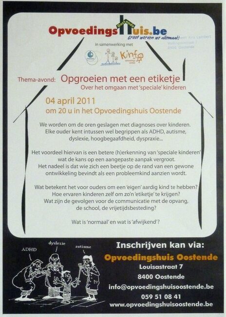 Affiche : Opvoedingshuis Oostende. Thema avond : Opgroeien met een etiketje, over het omgaan met 'speciale' kinderen. Opvoedingshuis Oostende. 4/4/2011