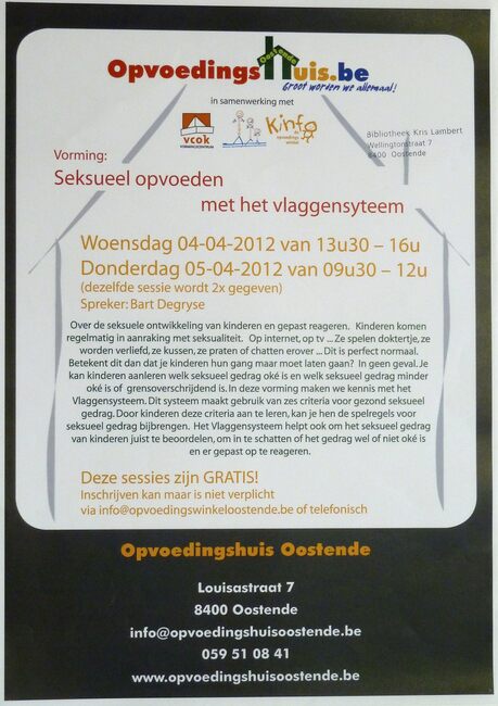 Affiche : Opvoedingshuis Oostende. Vorming : Seksueel opvoeden met het vlaggensysteem. Opvoedingshuis Oostende. 4-5/04/2012