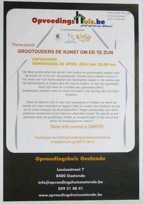 Affiche : Opvoedingshuis Oostende. Thema avond : Grootouders de kunst om er te zijn. Opvoedingshuis Oostende. 26/04/2012