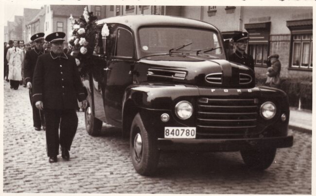 Formaat :14 x 9 cm. - De nieuwe lijkwagen "Ford" van de stad Oostende in de Overvloedstraat.