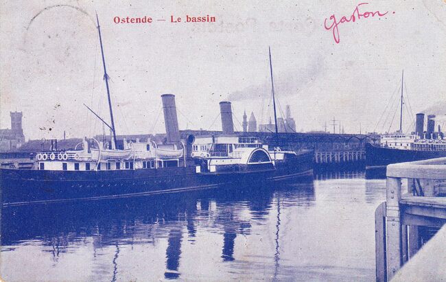 JC. - Pakketboten van de Oostende Dover lijn gemeerd nabij de werkhuizen van het Zeewezen op de oosteroever.
