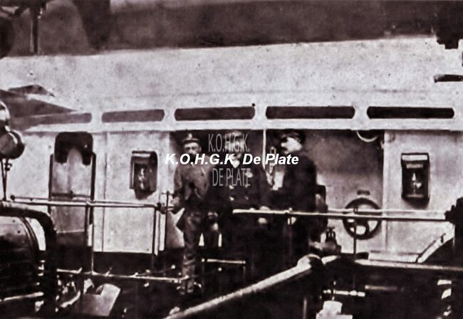 Afdruk, formaat : 29.5 x 21 cm. - De machinekamer met chef werktuigkundige, J. Eckmann