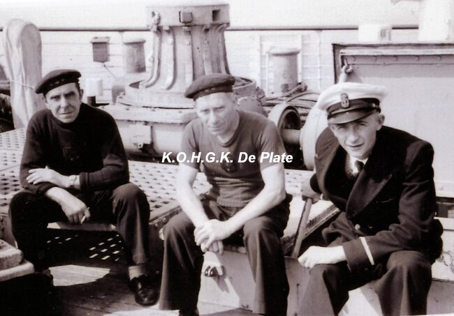 Afdruk, formaat : 29.5 x 21 cm. - 3 bemanningsleden rusten even uit op het achterdek