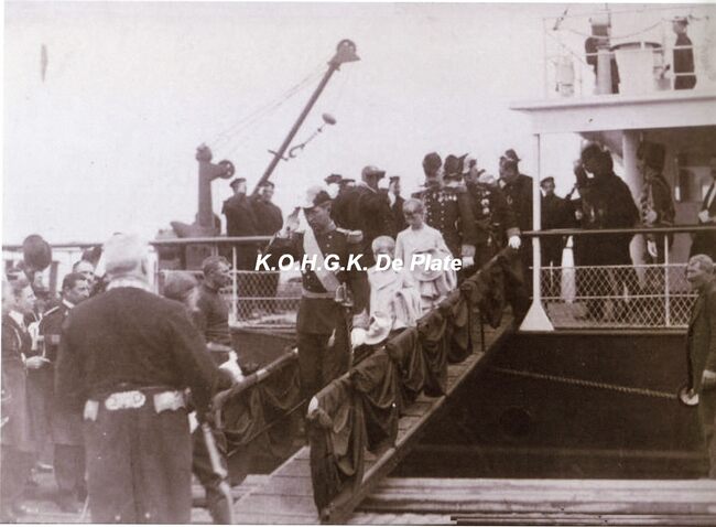 Foto (kopie), formaat : 29.5 x 21 cm. - Koning Albert I en de prinsen op de gangway van een pakketboot