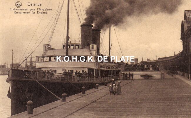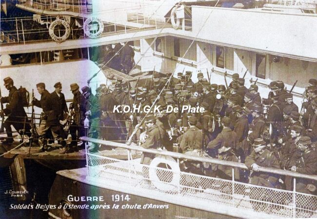 Afdruk van postkaart J. Courcier (Paris), formaat : 21 x 29,5 cm.- Pakketboot "Princesse Clémentine". Ontscheping van Belgische soldaten in de haven van Oostende na de val van Antwerpen 1914