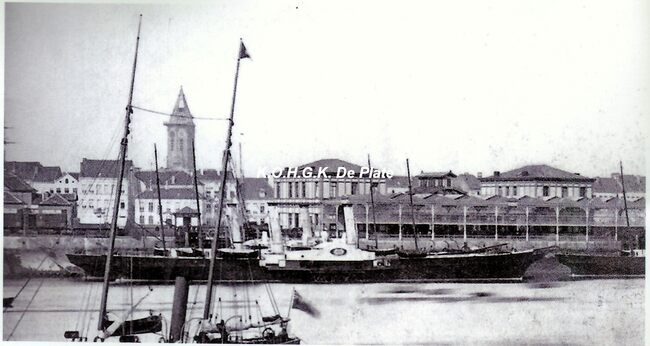 Afdruk, formaat : 15 x 9 cm. - De raderstoorboot "Prince Baudouin" (1872-1892) gemeerd nabij het eerste Zeestation. Op de achtergrond, de toren van de Sint-Pieterskerk bijgenaamd "De Peperbusse".…