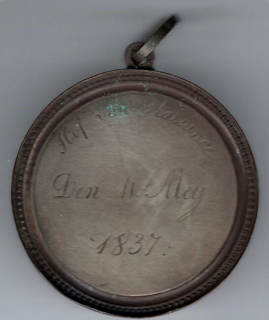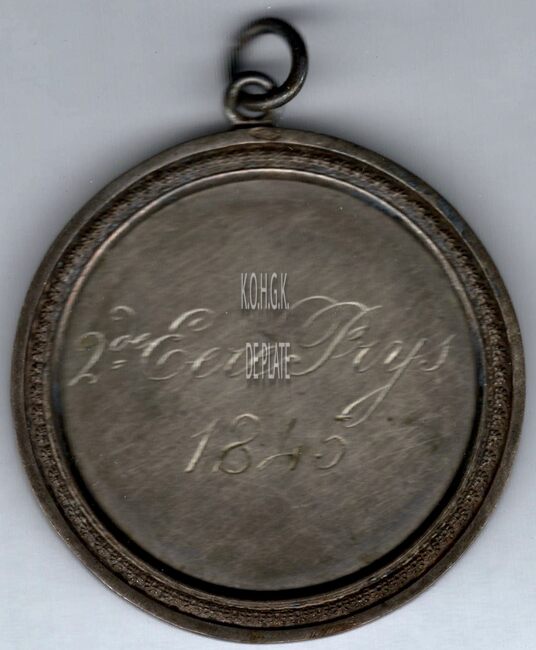 De prijspenning is rond met gladde geprofileerde rand, oog en ring, en is als volgt ingegraveerd