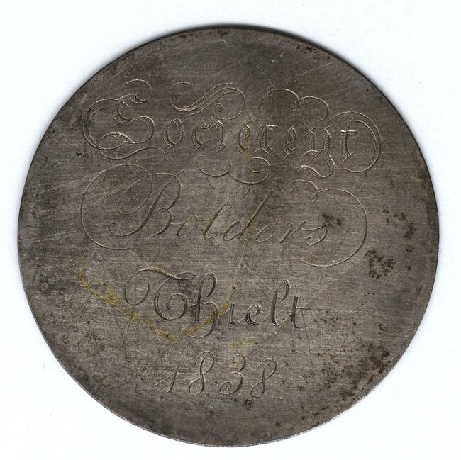 Op de voorzijde : horizontaal SOCIETEYT / BOLDERS/ THIELT / 1838