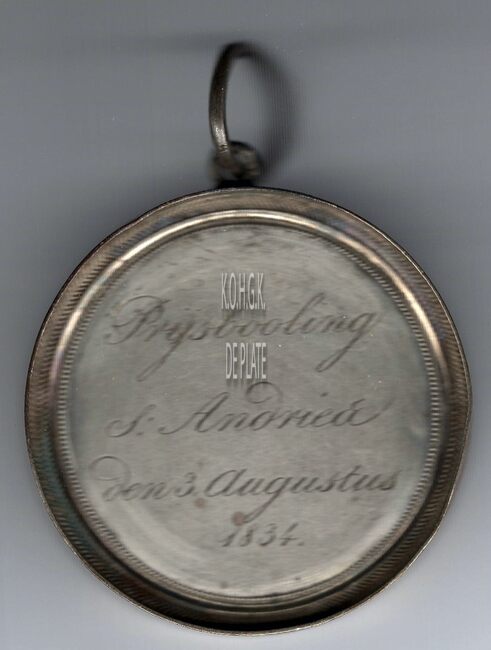 De prijspenning is rond met gladde rand in een vatting met geprofileerde parelrand, oog en ring, en is als volgt ingegraveerd