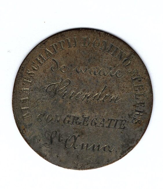 Op de voorzijde : rondom boven MAATSCHAPPIJ DOMINO SPELERS, horizontaal DE WAARE / VRIENDEN / CONGREGATIE / ST. ANNA