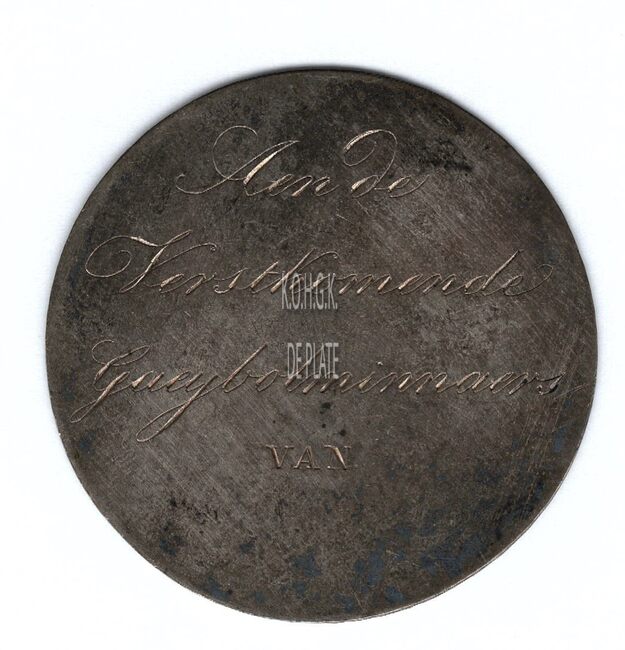 De erkentenispenning is rond met gladde geprofileerde rand en is als volgt ingegraveerd