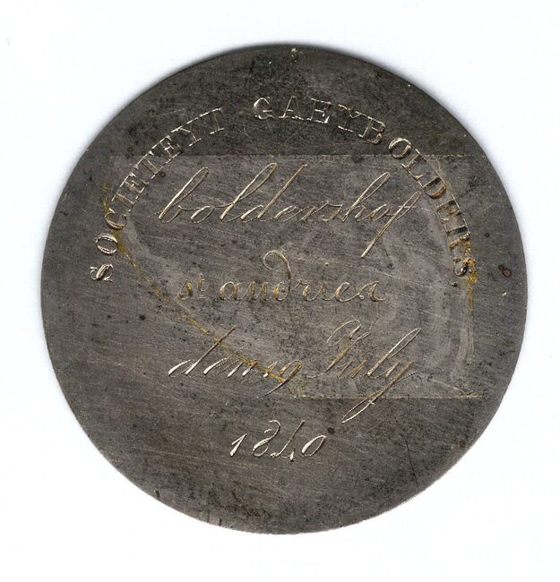 Op de voorzijde : rondom boven SOCIETEYT GAEYBOLDERS, horizontaal…