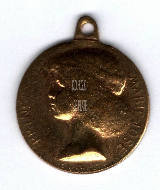 De gedenkpenning is rond in een vatting met gladde rand met rondom aan weerszijden een lauriertak onderaan samensgestrikt, daarnaast een parelrand, op de buitenrand een kroon met kruis op voluut en draagring en is als…