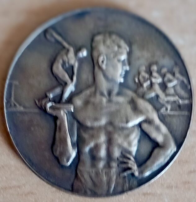 Op de voorzijde : boven aan weerszijden een guirlande, centraal dames die turnen, rechtsonder gesigneerd…