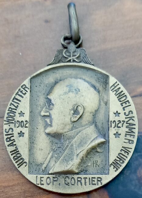 De gedenkpenning is rond met een gladde geprofileerde rand met kroon en ring …