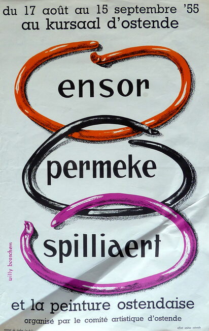 AFFICHESENSOR JAMES ; TENTOONSTELLINGENPERMEKE CONSTANT (1886-1952) (KUNSTSCHILDER BEELDHOUWER)SPILLIAERT LEON (1881-1946) (KUNSTSCHILDER)CASINO-KURSAAL ; TENTOONSTELLINGENKUNSTTENTOONSTELLINGENBOSSCHEM WILLY (KUNSTSCHILDER CARTOONIST PERSVERANTWOORDELIJKE KURSAAL)CERCLE ARTISTIQUE D'OSTENDE (SOCIO- CULTURELE)ENSOR PERMEKE SPILLIAERT ET LA PEINTURE OSTENDAISE (TENTOONSTELLING)