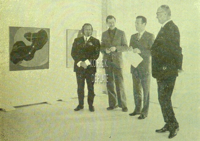 Foto : Vernissage in de Montrosezaal van het Casino-Kursaal. Van links naar rechts : Willy Bosschem, Luc Perot, Georges Fabry en Roger De Ramée