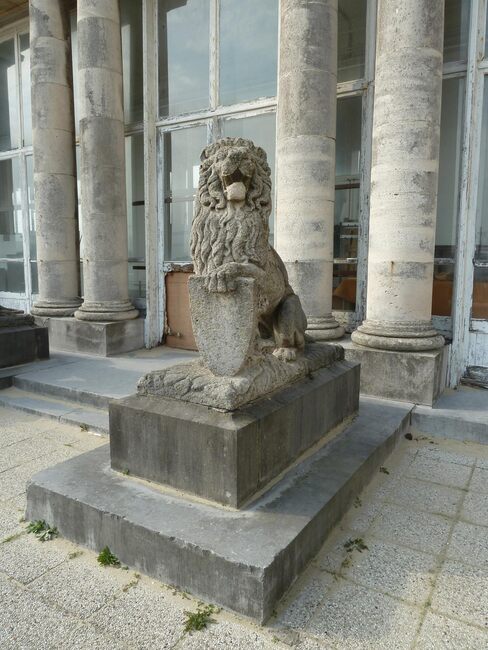 Schilddragende leeuwen uit zandsteen aan de zuidkant van de Koninklijke Gaanderijen. Geplaatst in 1916-1917, een tien jaar na de bouw van de Koninklijke Gaanderijen. Het werk van beeldhouwers Prosper Baeys en Georges…