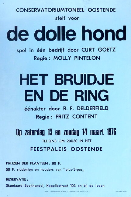 FOTO'SCONSERVATORIUM (TONEEL)VERENIGINGEN ; TONEELDEFOOR OCTAAF (1904-1999) (TONEEL)CANDAELE SIMONE (TONEELSPEELSTER)PINTELON MOLLY (1919-2008) (LERARES TONEELREGISSEUSE)DECLEER SUZY (TONEELSPEELSTER TONEELREGISSEUSE)SEURYNCK STAF (1910-1982) (TONEELSPELER REGISSEUR)PINTELON FREDDY (TONEELREGISSEUR)DIRICKX AUGUST (TONEELSPELER)SCHMITZ RIKKEVERMEIRSCH RENE (TONEELSPELER)SIMOENS GISELE (TONEELSPEELSTER)WITTESAELE NANNA (TONEELSPEELSTER)DE ZWAAN (TONEELSTUK)TONEELSTUKKEN