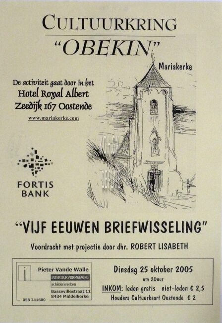 Affiche : Cultuurkring Obekin. "Vijf eeuwen briefwisseling". Hotel Royal Albert. 25/10/2005.