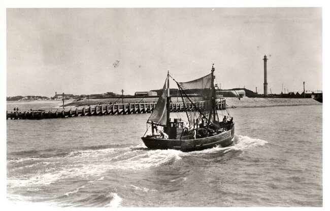Best, Anvers. - Ostende - Chaloupe de crevettes. Oostende - Garnaalsloep. - Op de achtergrond, de oosteroever met een gedeelte van het Ooststaketsel, de "Halve Maan" en de vierde vuurtoren "Lange Nelle…