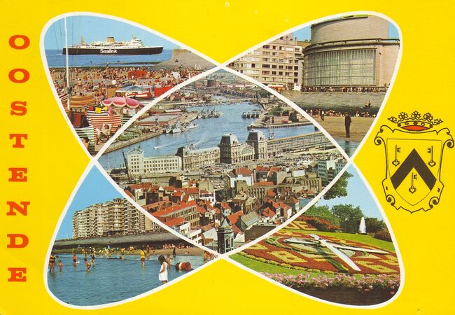 Cromo, Krüger, N° 933/120. - Inzet : "Montmartre" in de Langestraat ; Het Leopold II monument ; Het bloemenuurwerk ; Het beeldhouwwerk "De Zee", of "Dikke Mathille" van George Grard ; De Albert I-promenade ; De…