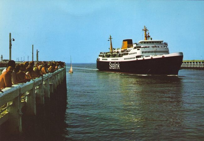 Cromo. - Vissersvaartuigen gemeerd in het Montgomerydok. De carferry "Artevelde" in de havengeul