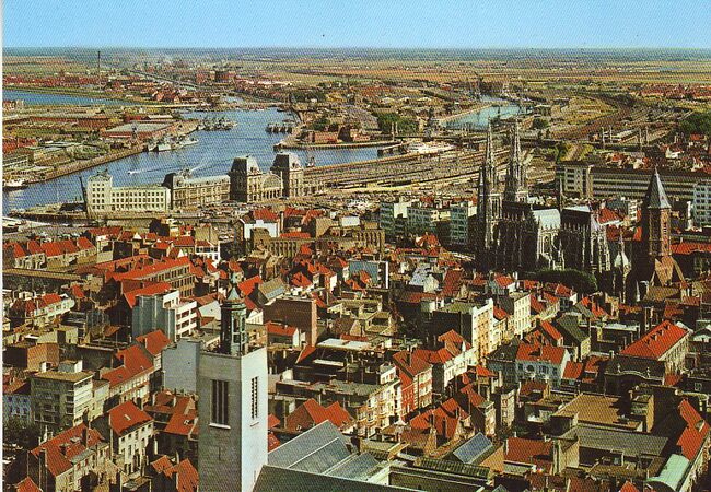 Cromo. - Het centrum van de stad, gezien vanaf de woontoren "Europacentrum" in de Van Iseghemlaan. Vooraan, de toren van het Feest- en Cultuurpaleis op het Wapenplein. Vanaf de toren tot aan de toren, de "…